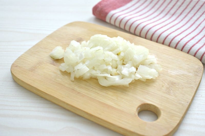 Очищаем репчатый лук, шинкуем его кубиком и добавляем к обжаренной курице.