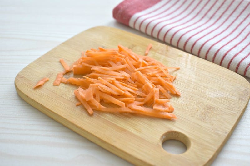 Следом выкладываем к ингредиентам нарезанную соломкой морковку. Продолжаем жарить дальше курицу с овощами еще 5 минут.