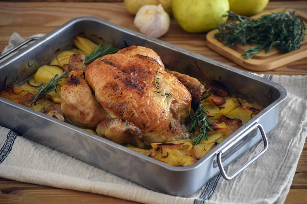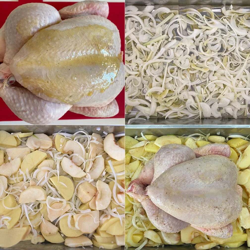 Очень простой рецепт запеченной курицы в классическом стиле с овощами и яблоками