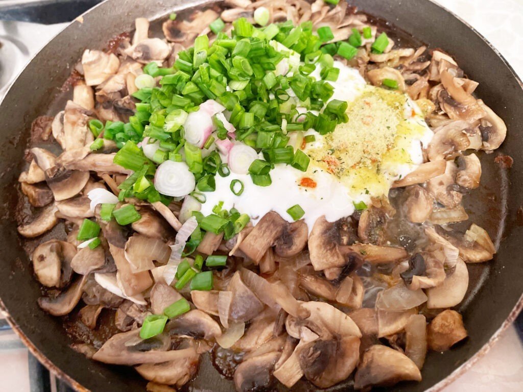 После этого добавляем нарезанный зелёный лук, сметану и специи по вкусу. Если в выбранных специях нет соли, то грибы можно посолить.