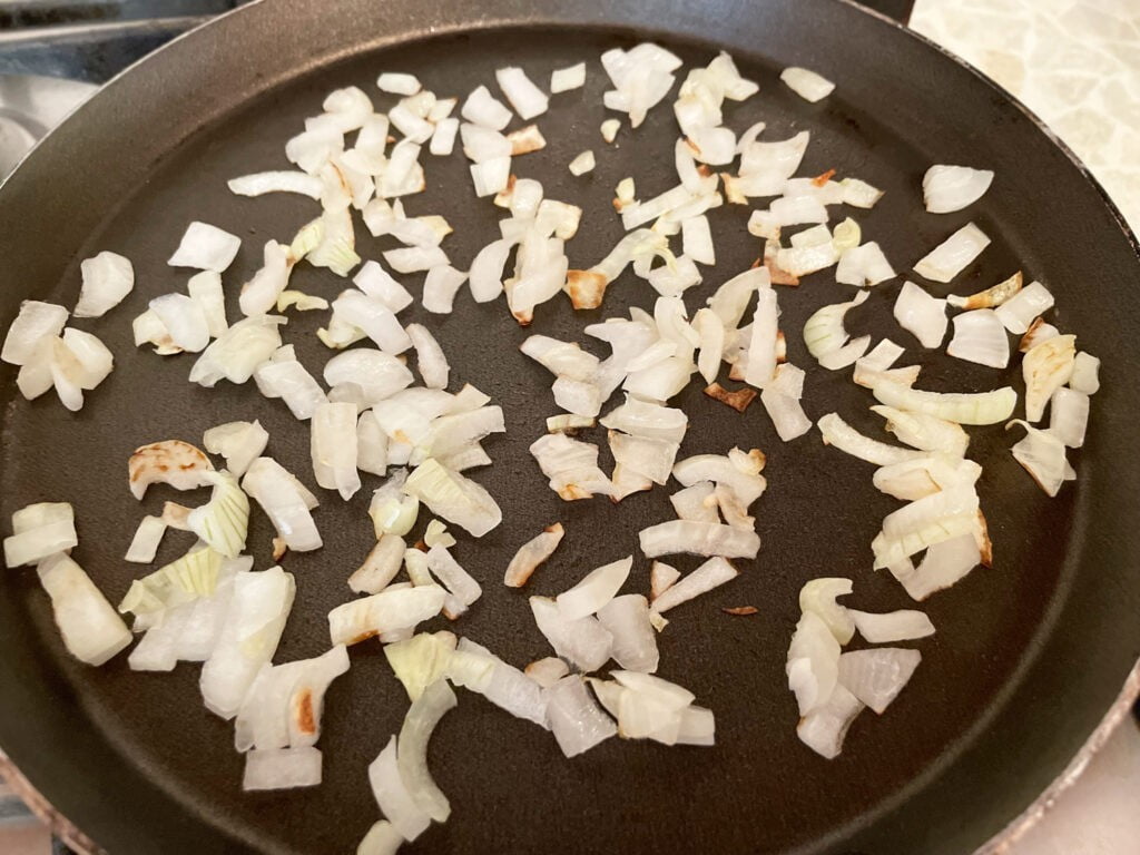 Почистите репчатый лук и мелко нарежьте его. Обжарьте на растительном масле на сковороде до тех пор, пока лук не станет полупрозрачным.