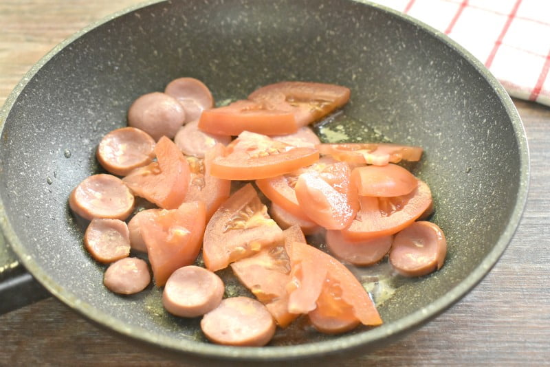 Тщательно промываем свежий помидор, нарезаем его тонкими ломтиками и добавляем на сковороду к сосискам. Перемешиваем, продолжаем обжаривать минуту.