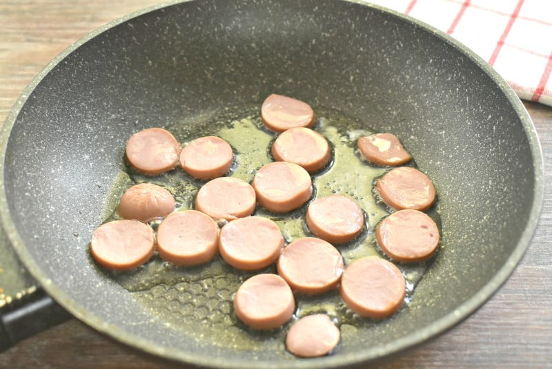 Вливаем на сковороду растительное масло и разогреваем его. Очищаем сосиску от плёнки и нарезаем колечками. Нарезку из сосиски выкладываем в горячее масло и обжариваем пару минут, периодически перемешивая.