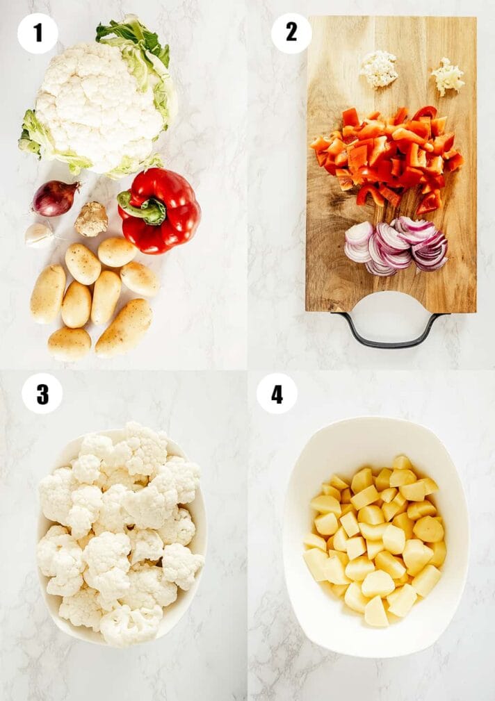 Цветную капусту разрежьте на соцветия среднего размера. Очистите картофель и нарежьте его кубиками