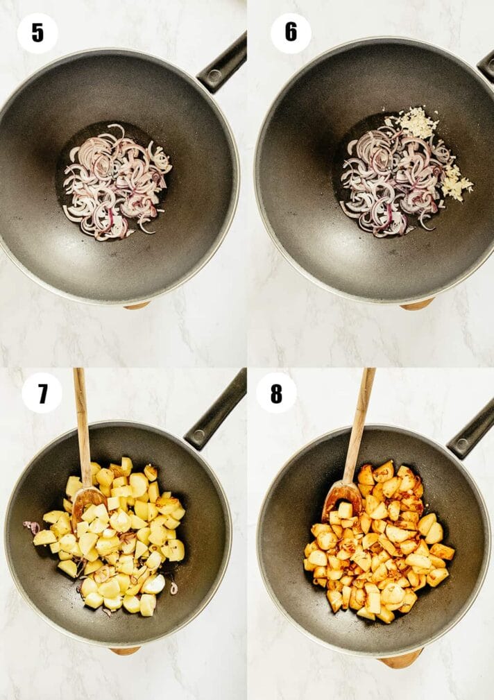 Нагрейте немного масла в большой сковороде и обжарьте лук 2–3 минуты. Затем добавьте измельченные чеснок и имбирь и готовьте еще минуту. Затем добавьте картофель и готовьте еще 3 минуты. Добавьте порошок карри, тмин и красную пасту карри и хорошо перемешайте. Готовьте еще 1 минуту.