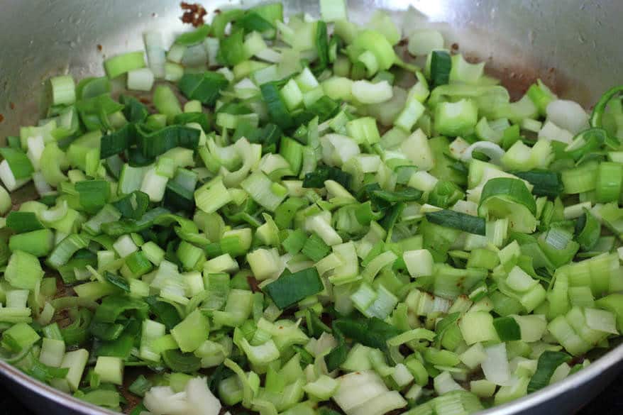 Нагрейте сливочное масло в большой сковороде на средне-сильном огне и обжарьте лук-порей до мягкости, 5–7 минут достаточно. Добавьте вино, соль, перец, доведите до кипения и тушите лук 2 минуты, пока алкоголь не выпарится. Переложите в миску и отложите в сторону.
