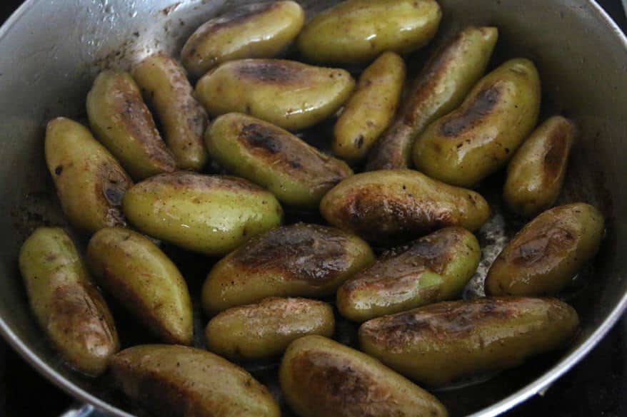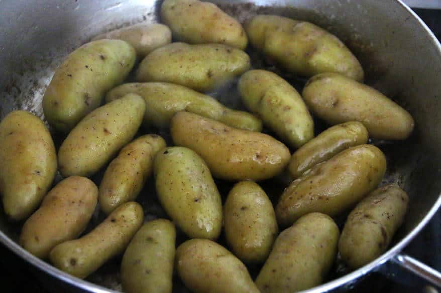 Добавьте сливочное и растительное/оливковое масло в ту же сковороду и нагрейте на среднем огне. Как прогреется — забросьте картофель и обжарьте его до румяного цвета со всех сторон. Это займет несколько минут.