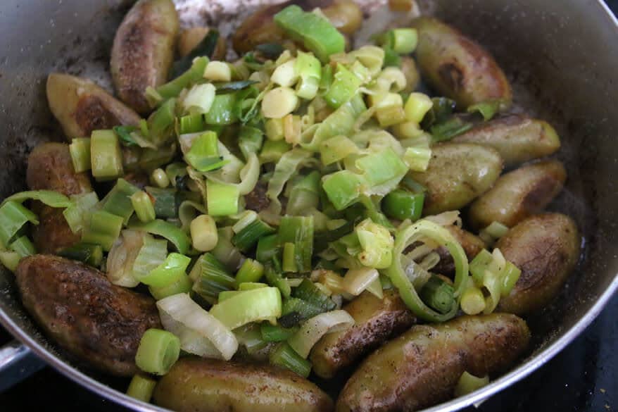Верните лук-порей к картофелю, перемешайте и прогрейте.