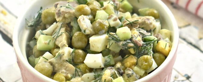 Ингредиенты горошек зеленый — 4 ст. л. огурец свежий — 1 шт. яйцо — 2 шт. консервы рыбные в масле — 1 банка зелень —