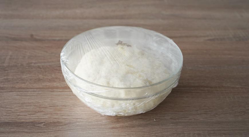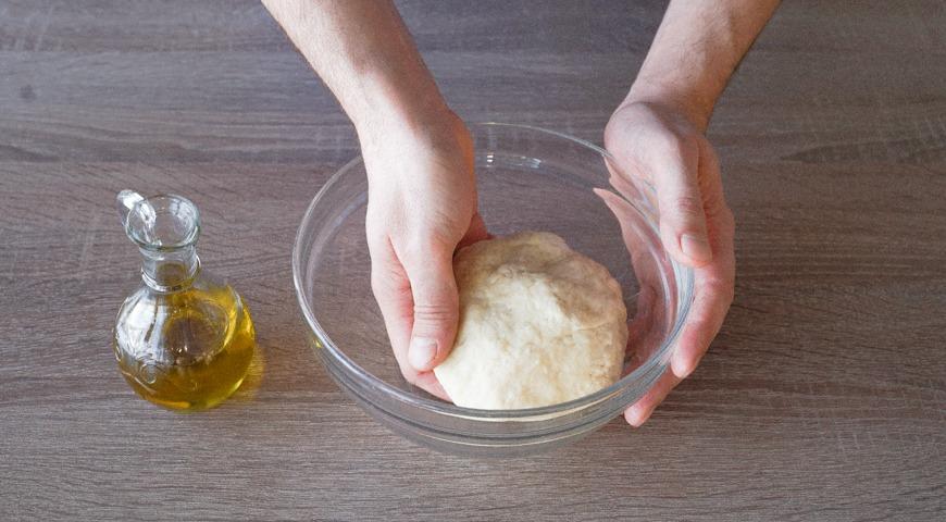 Из теста для пиццы сформуйте шар. Смажьте его оставшимся маслом. Затяните миску пищевой пленкой. Уберите тесто в теплое место и оставьте на 1-1,5 часа, до увеличения в объеме в 2 раза.