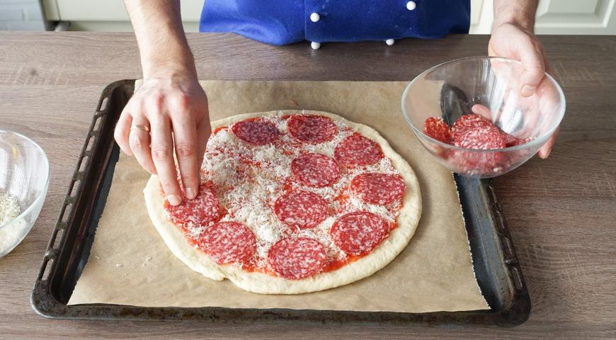 Приготовьте начинку для пиццы. Твердый сыр натрите на мелкой или средней терке. Копченую колбасу нарежьте тонкими кружочками.