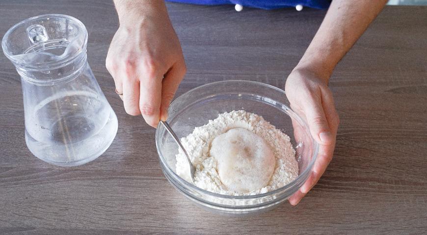 Приготовьте тесто для пиццы с копченой колбасой и сыром. Сначала в маленькую мисочку насыпьте сухие дрожжи, залейте 3 ст. л. теплой воды и перемешайте. Оставьте на 15 минут, чтобы дрожжи стали работать.