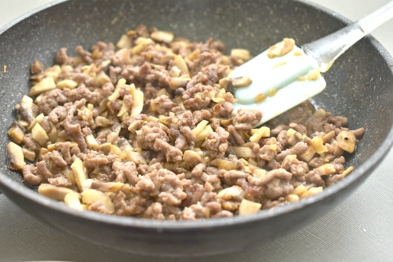 Поскольку тесто у нас уже готово для пирожков, примемся за начинку. Очищаем репчатый лук и нарезаем его маленькими кусочками. Обжариваем лук в разогретом растительном масле на сковороде 2-3 минуты. Спустя это время добавляем к луку мясной фарш. Перемешиваем, продолжаем обжаривать 5-6 минут. Тщательно промытые и обсушенные свежие шампиньоны нарезаем кубиками, добавляем к ингредиентам на сковороду, по вкусу солим и перчим. Перемешиваем, готовим следующие 6-7 минут. Начинку из мяса и грибов остужаем.