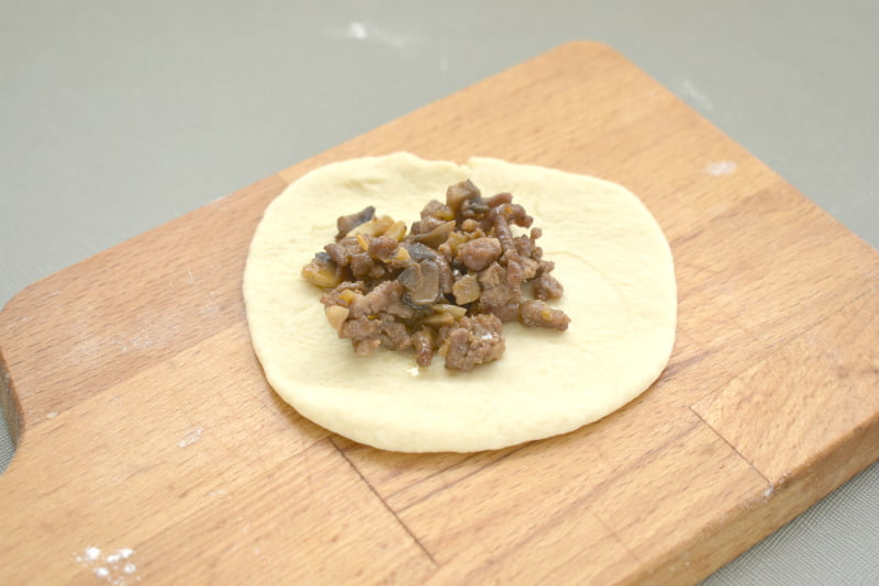 Каждый кусочек раскатываем в лепёшку, а в центр укладываем примерно 2 столовые ложки начинки из мяса и грибов.