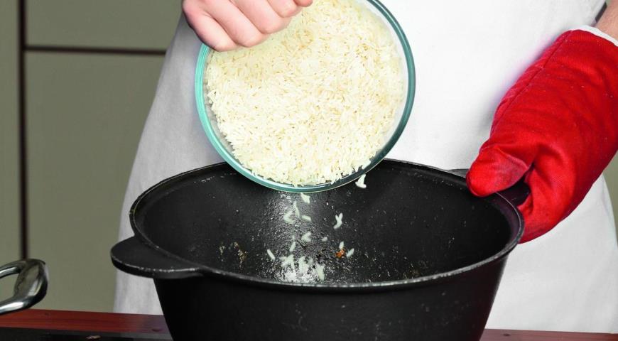 Увеличьте огонь под казаном, положите в него стручок перца и чеснок. Рис еще раз промойте и откиньте на дуршлаг. Положите в казан рис и разровняйте поверхность. Аккуратно влейте по стенке казана примерно 800 мл кипящей воды (вода должна быть выше уровня риса на 2 см). Закройте крышкой и как можно быстрее доведите до кипения. Когда плов закипит, снимите крышку и уменьшите огонь до среднего. Дождитесь, пока вода уйдет с поверхности плова, и уменьшите огонь до слабого. Накройте казан крышкой и готовьте еще 20 мин.