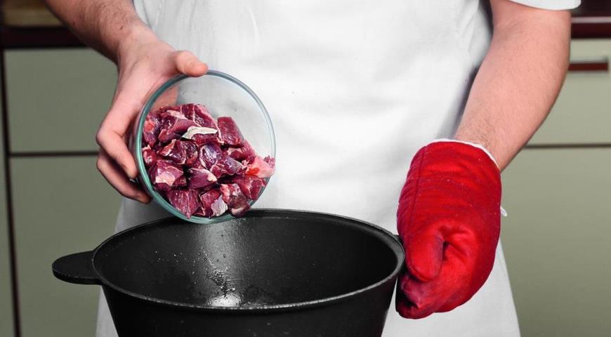 Разогрейте казан. Налейте растительное масло и дождитесь, пока оно хорошо раскалится. Затем добавьте лук и жарьте до светло-коричневого цвета, 10 мин. Добавьте баранину, жарьте, помешивая, 10 мин. Положите в казан морковь, посыпьте зирой и готовьте еще 15 мин.