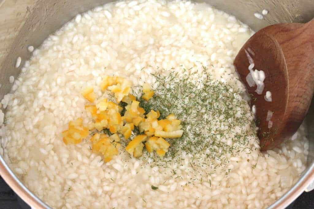Добавьте консервированный лимон (ссылка на его приготовление в шапке), укроп и соль. Продолжайте добавлять бульон по 1/4 стакана за раз, регулярно помешивая, пока рис не впитает бульон, не начнет набухать и приобретет кремовую текстуру (это займет 20-25 минут).