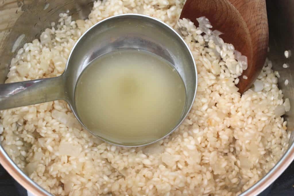 Добавьте примерно четверть горячего рыбного бульона. Готовьте, регулярно помешивая, пока большая часть бульона не выпарится.