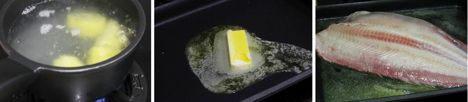 Поскольку рецепт готовится в короткие сроки, начнем с гарнира, так как приготовленный картофель становится мягким примерно через двадцать минут. Две картофелины разрезаем пополам, чтобы получилось четыре штуки, и варим в большом количестве воды с чайной ложкой соли. Если картофель мелкий — варим целиком.