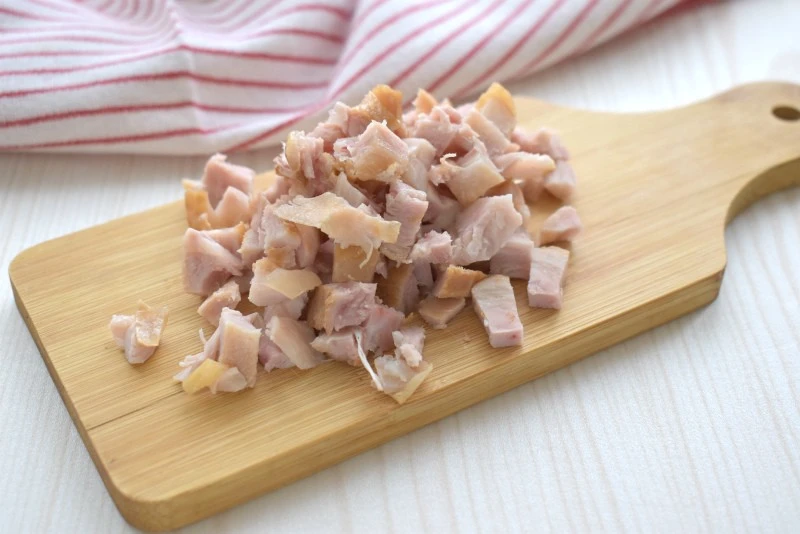 Копчёное куриное мясо нарезаем небольшими кубиками и переправляем их в миску.
