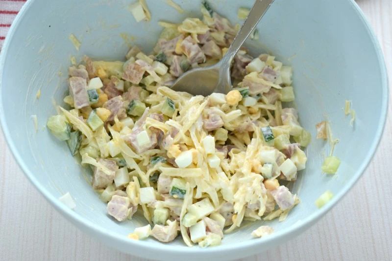 Ингредиенты заправляем майонезом, по вкусу солим и перчим. Перемешиваем.