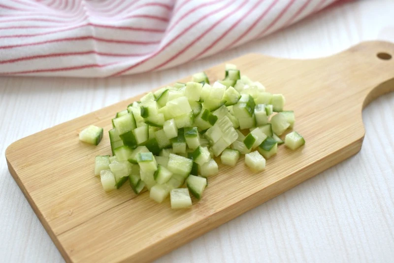 Промываем свежий огурец, срезаем кончики, а затем измельчаем кубиками. Добавляем огуречную нарезку к куриному мясу.