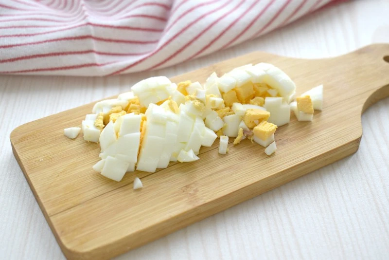 Заранее отвариваем яйцо (время варки 11-12 минут после закипания воды). Остужаем яйцо в ледяной воде, затем рубим кубиками и переправляем в состав салата.
