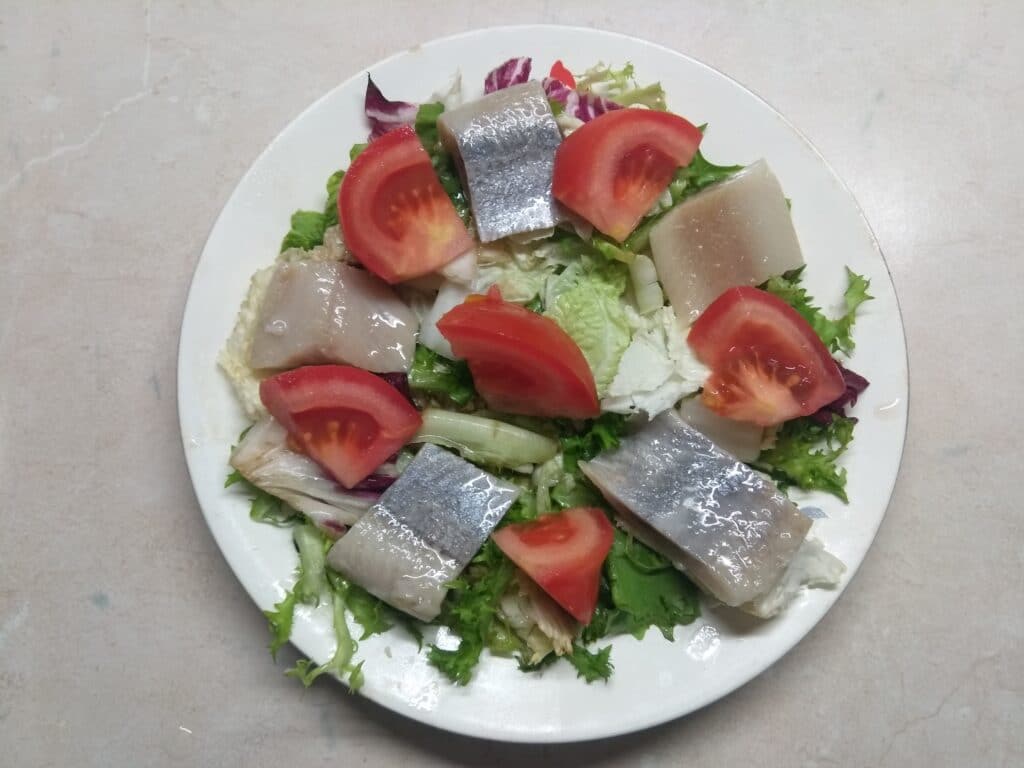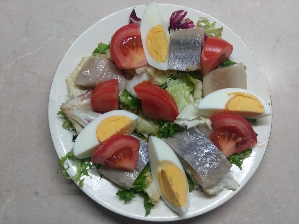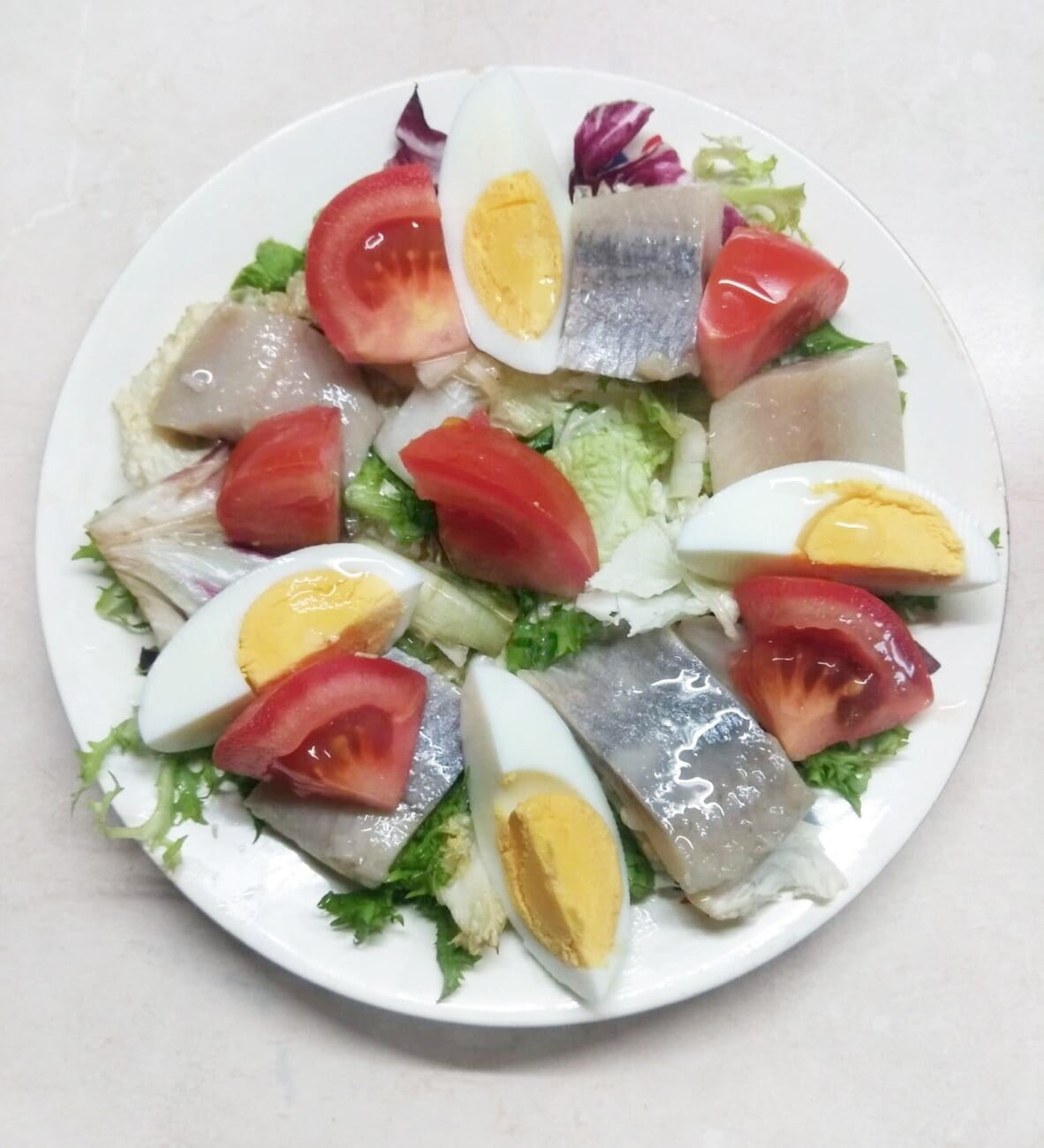 Салат селедкой, свежим помидором и варёным яйцом