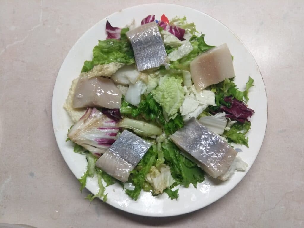 2. Кусочки селедки разложить по листьям салата.