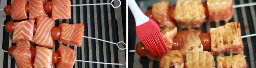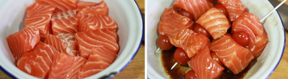 Нанизываем куски лосося на шампуры — каждый кусочек лосося можно чередовать с помидоркой черри. Помидоры можно заменить на грибы, перец или любой другой овощ. Готовим рыбу на мангале или на сковороде гриль до 2-3 минуты с каждой стороны.