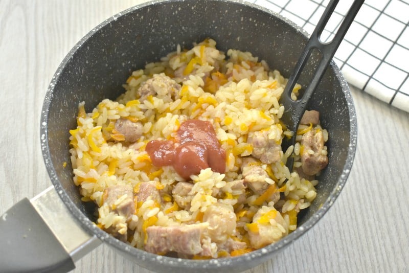 Тушим свинину с рисом под крышкой 20 минут. Затем добавляем томатный соус, перемешиваем и готовим ещё 5 минут.