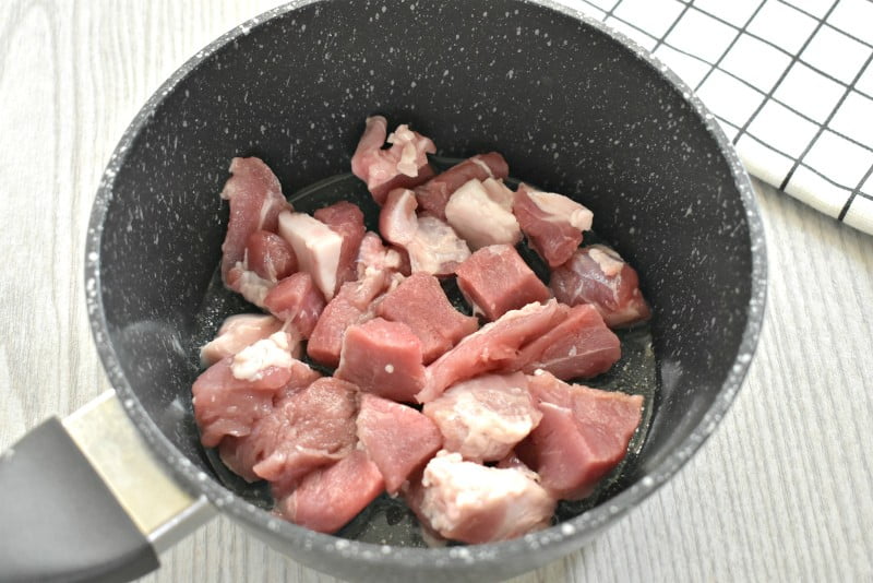 Свинину промываем под проточной водой и обсушиваем бумажными полотенцами. Нарезаем мясо небольшими кусочками. В сотейнике или в казане разогреваем растительное масло, выкладываем кусочки свинины и обжариваем на сильном огне 10 минут, периодически перемешивая.