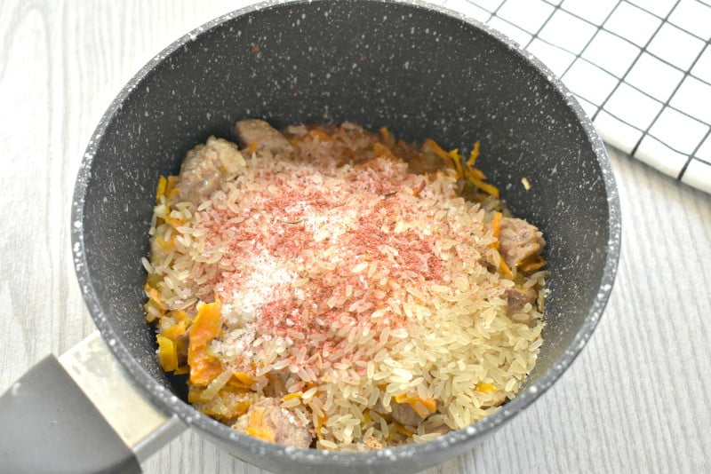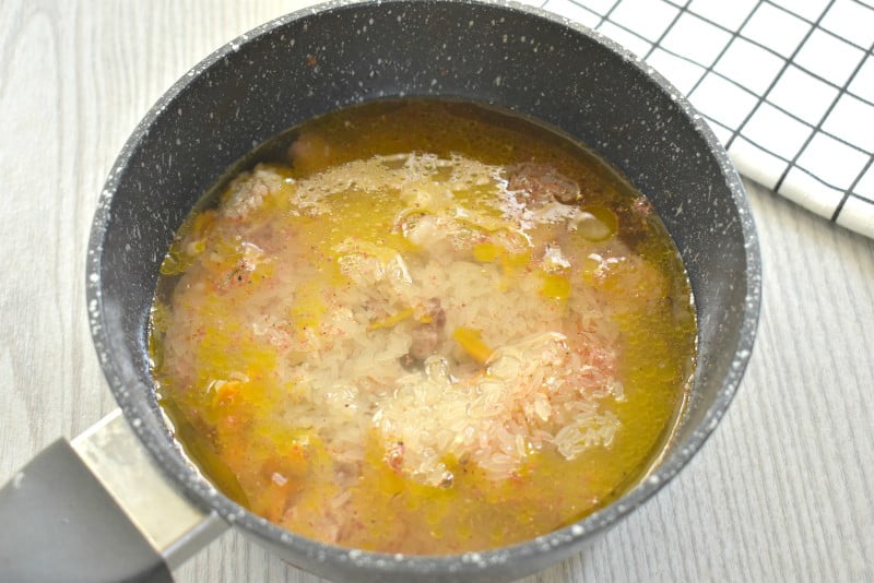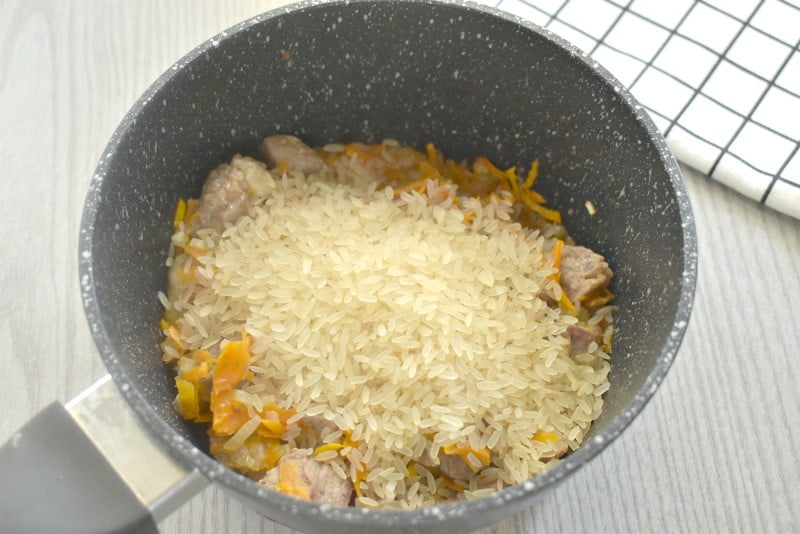 К ингредиентам добавляем рис. В данном рецепте используется пропаренный рис, промывать его не обязательно.