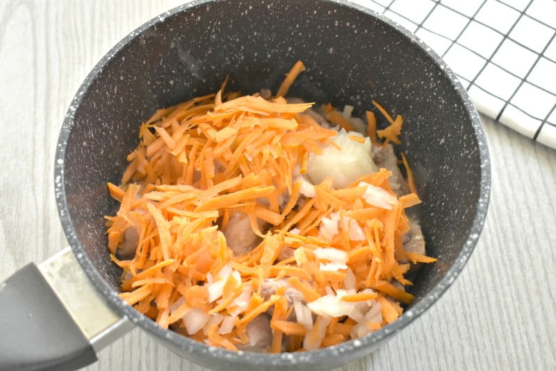 К обжаренной свинине добавляем тёртую морковь и лук, перемешиваем, продолжаем готовить ещё 5-7 минут.