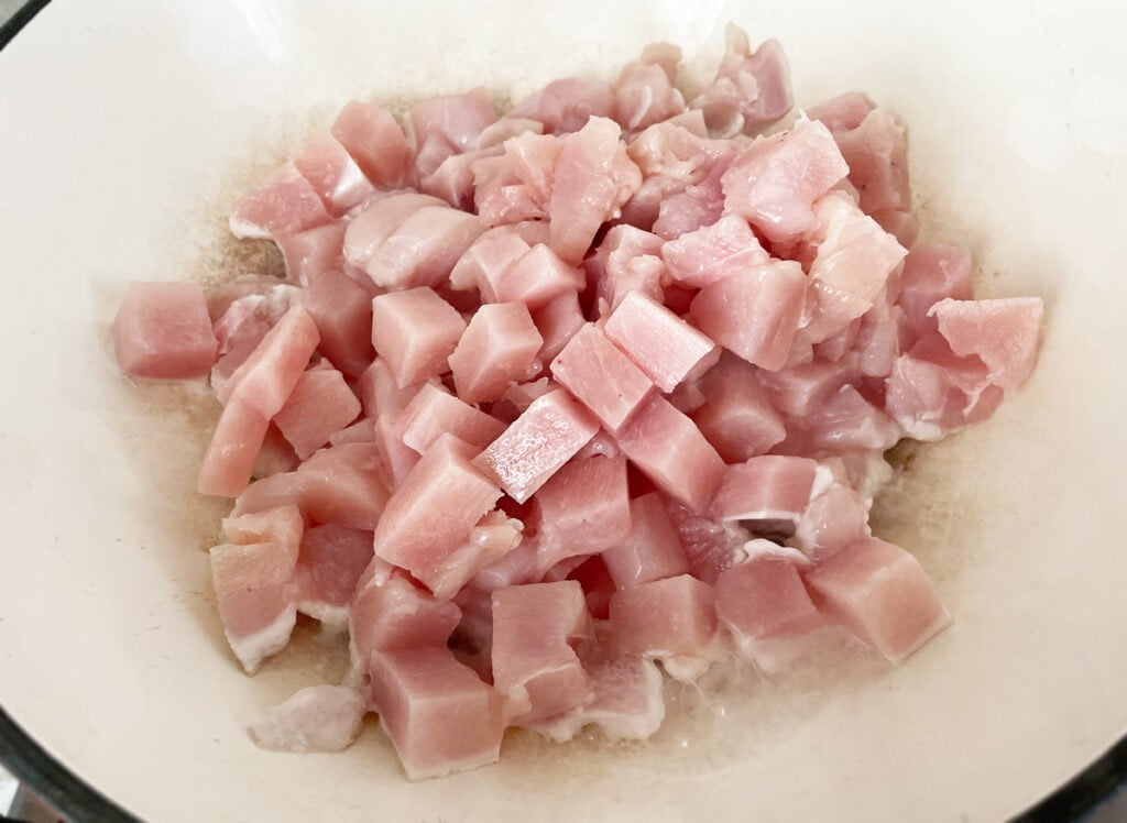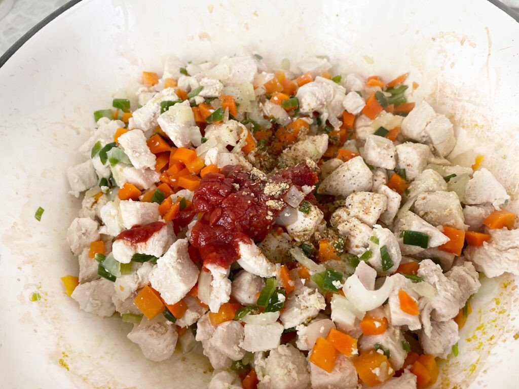 Куриное филе промойте и порежьте небольшими кусочками. Обжарьте или протушите на сковороде, пока мясо не побелеет. Примерное время – 5-7 минут.