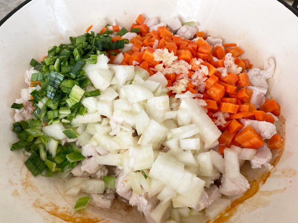 Добавьте к мясу нарезанную морковь, репчатый лук, измельченный чеснок и зеленые части лука порей. Тушите, периодически помешивая, еще 10 минут.