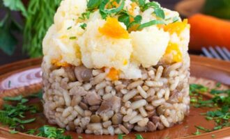 | 5 | Сделать пюре из вареного картофеля. Добавит в пюре морковь с луком, брокколи, болгарский перец и горошек. Посолить, перемешать. |