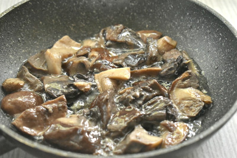 Разогреваем на сковороде растительное масло. Выкладываем размороженные грибы и обжариваем их на сильном огне 5 минут.