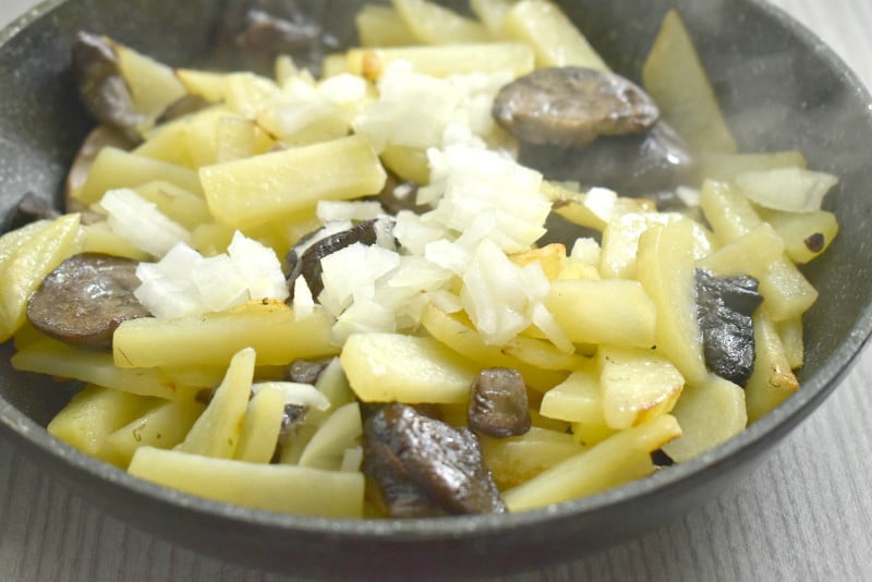Спустя 10 минут добавляем к грибам и картошке измельченный репчатый лук.