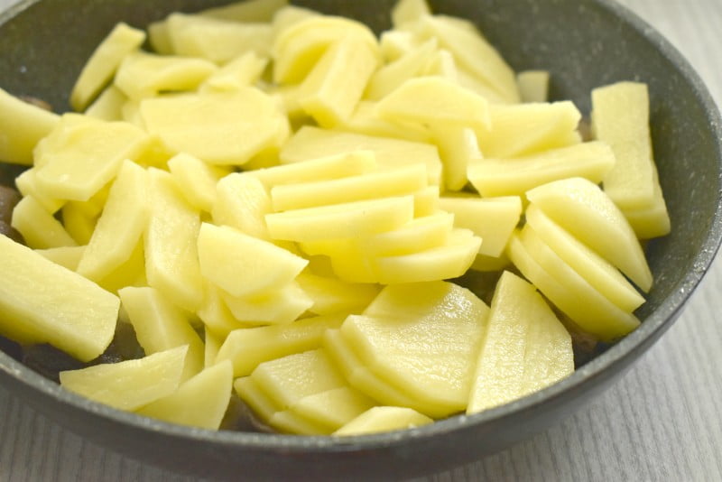 Очищаем картофель, нарезаем его ломтиками и добавляем к грибам на сковороду. Перемешиваем, обжаривая на сильном огне 10 минут. Иногда картошку с грибами перемешиваем.