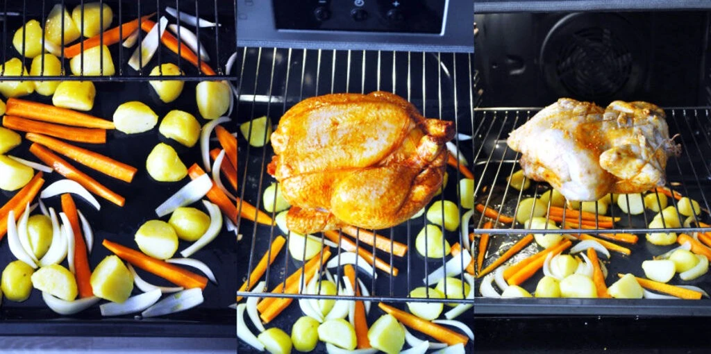 Во время запекания сок курицы капает на овощи, передавая аромат. Можно время от времени открывать духовку, чтобы помешивать и переворачивать овощи , чтобы они равномерно прожарились. На прожарку курицы это не повлияет.