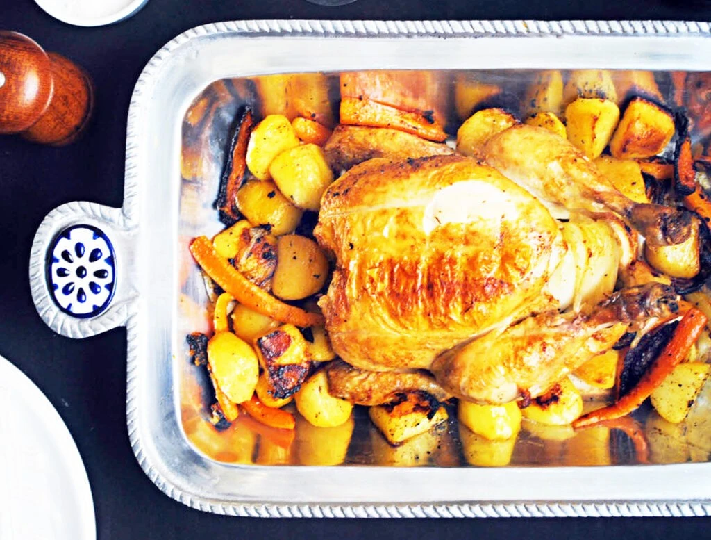 Запекайте еще 30–45 минут или пока температура курицы внутри не достигнет 74°C. По истечении общего времени запекания достаем курицу из духовки и даем ей постоять несколько минут, прежде чем нарезать ее и подавать вместе с овощами.