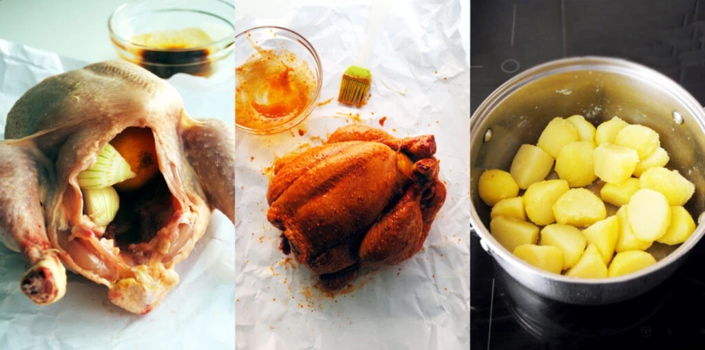 Начинаем с курицы, очищая ее от внутренностей и промывая под струей холодной воды. Тщательно просушиваем впитывающей бумагой. Этот шаг очень важен: тушка должна быть сухой, чтобы хорошо приготовилась и была сочной внутри, но получилась хрустящей снаружи.
