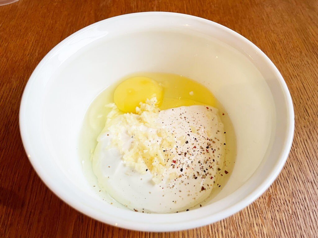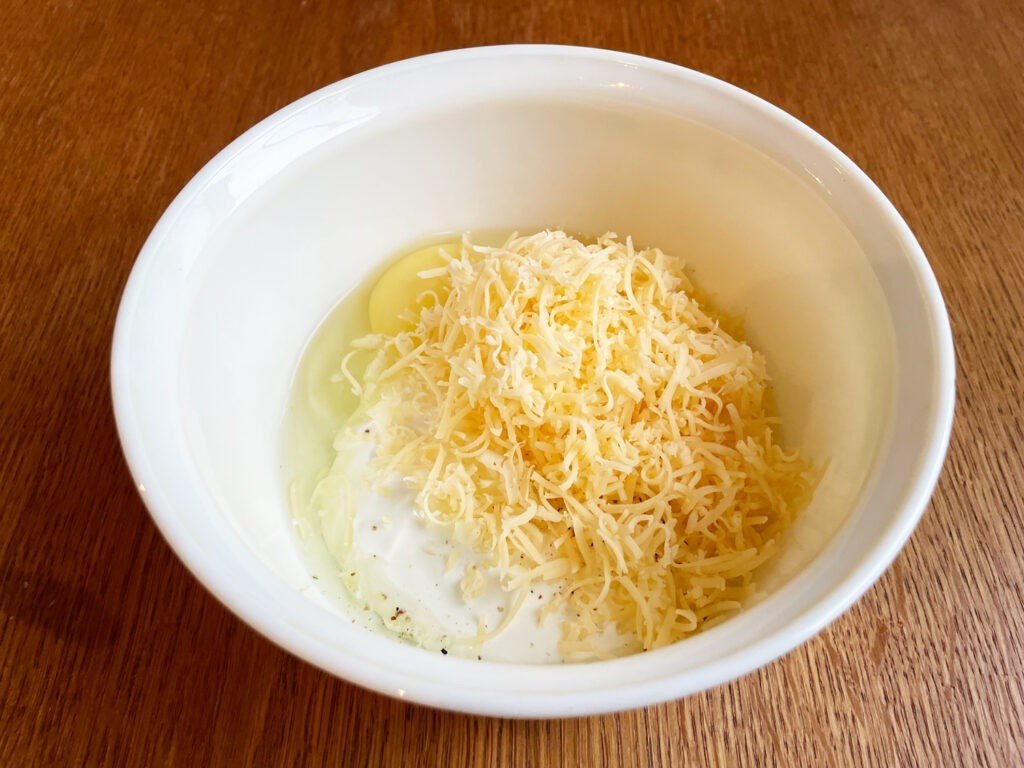 В чаше смешать сметану и яйцо. Добавить черный молотый перец (соль я не добавляю, так как сыр и так соленый).