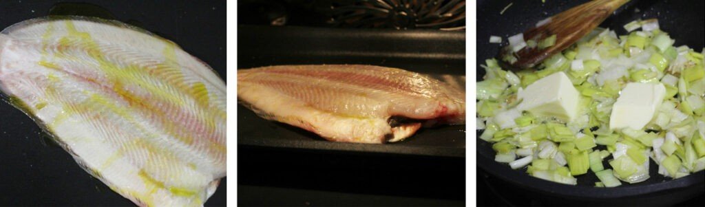 Рыбу выложить в форму для запекания, посолив предварительно и сбрызнув сверху небольшим количеством масла. Выпекаем рыбу при температуре 200º 10 минут. За это время готовим соус из лука-порея. Нарезаем лук-порей, обжариваем его на сливочном масле в течение восьми-десяти минут.