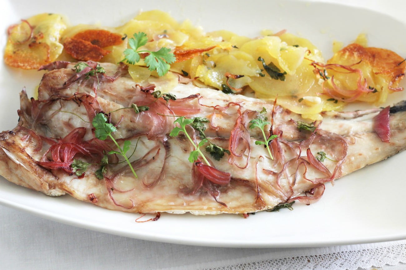 Когда картофель подзапечется, минут через десять, открываем духовку и кладем сверху рыбу, которую также присыпем луком и кинзой, предварительно приправив ее солью и перцем. Оставляем сибаса запекаться в духовке максимум 20 минут или до готовности. Когда все будет готово, достаем рыбу из духовки.