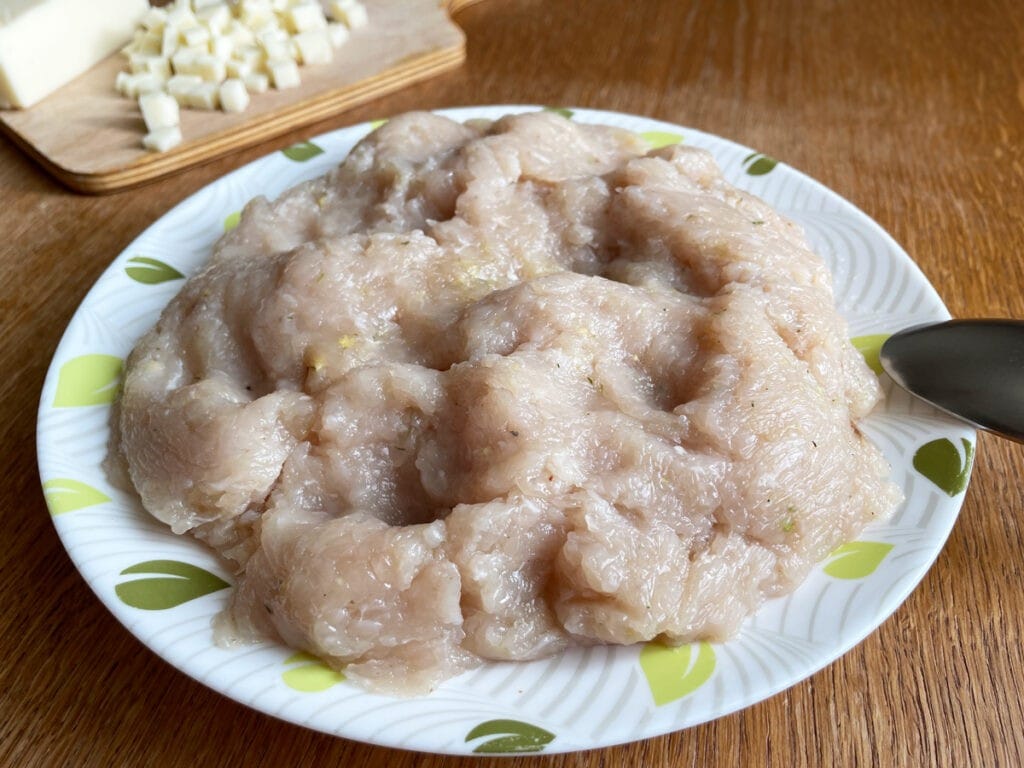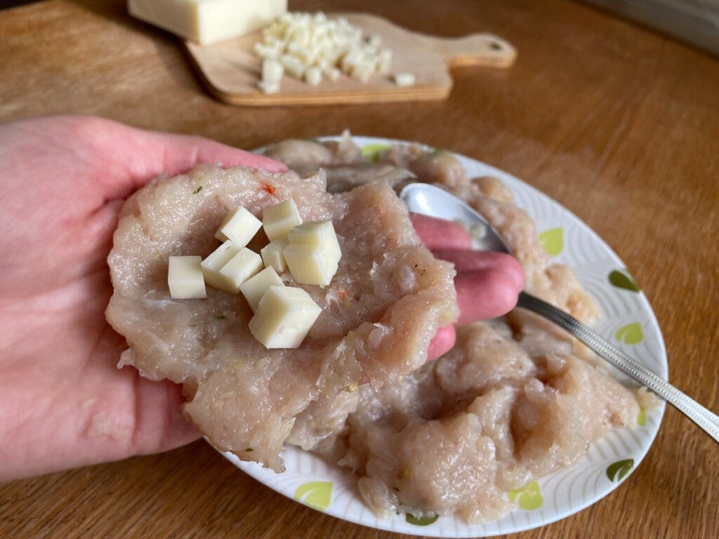 Ложкой набрать порцию фарша. Сформировать шарик, затем приплюснуть, чтобы получилась лепешка. На нее выложить несколько кубиков сыра.