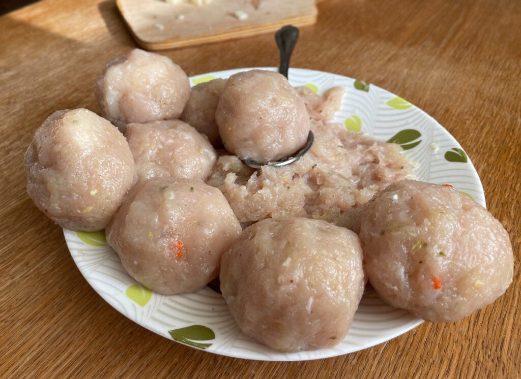 В перекрученный куриный фарш добавить измельченный или пропущенный через мясорубку репчатый лук. Добавить специи и перемешать. Слегка отбить.