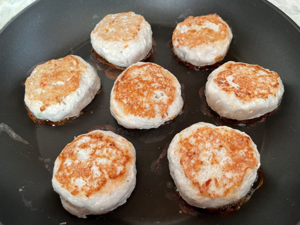 Поставить на плиту разогреваться сковороду. Если сковорода имеет антипригарное покрытие, масло использовать не нужно. Пока разогревается сковорода, налепить котлетки. Если они липнут, можно смочить руки в воде. Итак, заготовки готовы, сковорода нагрета.