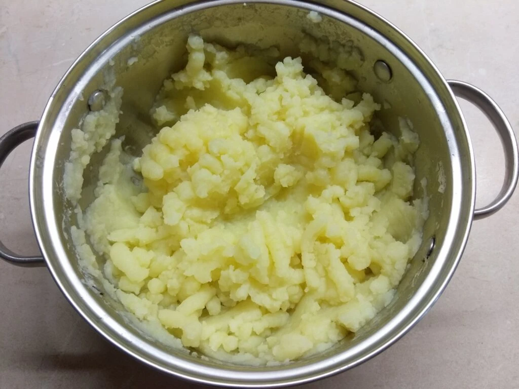 - Картофель помыть, очистить и нарезать крупными кусками. Отварить в подсоленной воде. Размять в пюре.